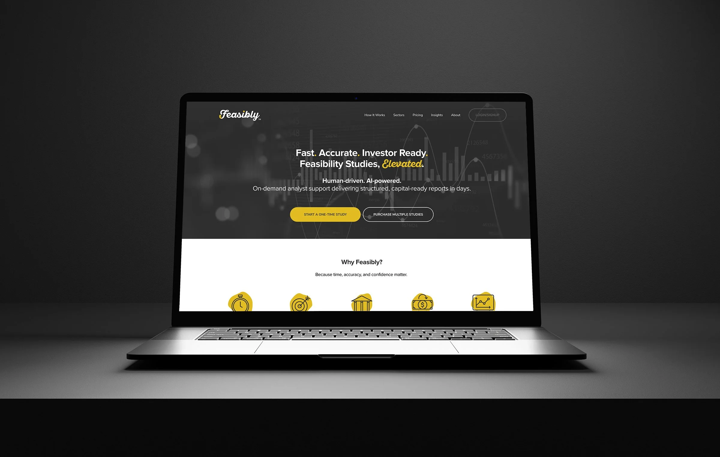 A conversion-driven website was developed as the core of Feasibly’s marketing system. The build included a homepage, sectors hub, pricing and product tiers, founders’ story, press room and lead-capture pathways. All copy was crafted to balance clarity, authority and technical accuracy while reinforcing the brand’s human-guided AI positioning.